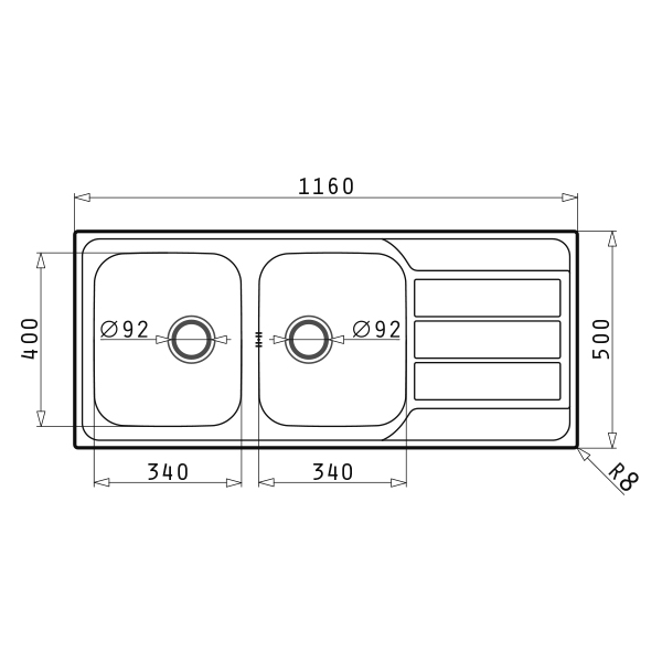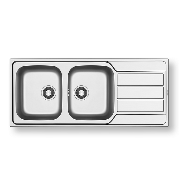 Ανοξείδωτος νεροχύτης Pyramis διαστάσεων 116x50cm της σειράς Athena Extra, σε σατινέ φινίρισμα από άριστης ποιότητας ατσάλι (CrNi 18/10), τύπου AISI 304, με δύο γούρνες και ποδιά για ένθετη (easyfix) εγκατάσταση.