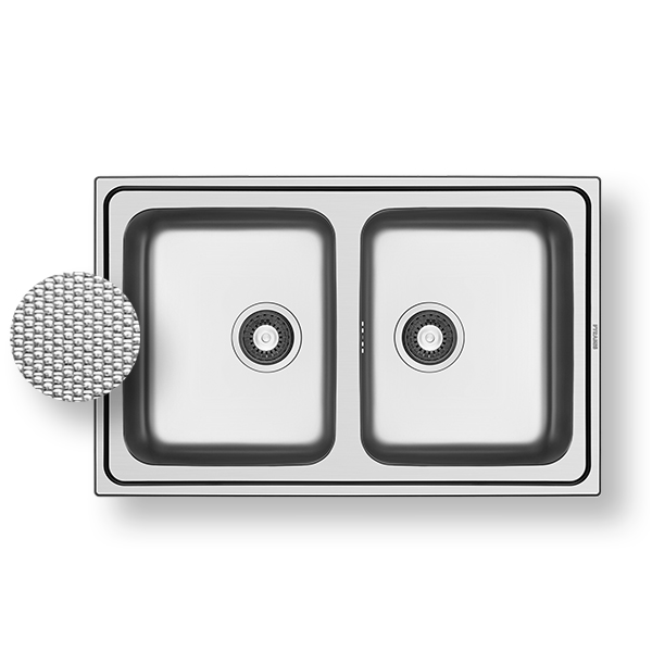 Ανοξείδωτος νεροχύτης Pyramis διαστάσεων 79x50cm της σειράς Alea, σε σαγρέ φινίρισμα από άριστης ποιότητας ατσάλι (CrNi 18/10), τύπου AISI 304, με δύο γούρνες και ένθετη (easyfix) εγκατάσταση.
