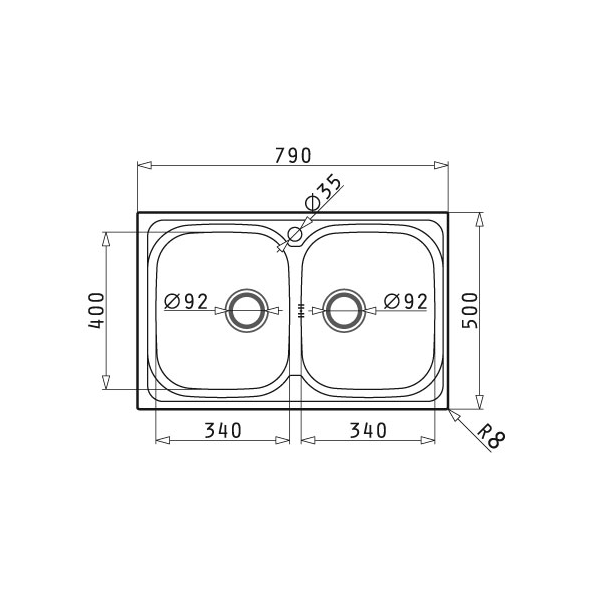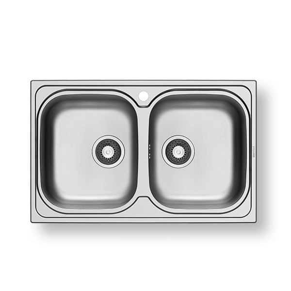 Ανοξείδωτος νεροχύτης Pyramis διαστάσεων 79x50cm της σειράς Amaltia, σε γυαλισμένο φινίρισμα από άριστης ποιότητας ατσάλι (CrNi 18/10), τύπου AISI 304, με δύο γούρνες και ένθετη (easyfix) εγκατάσταση.