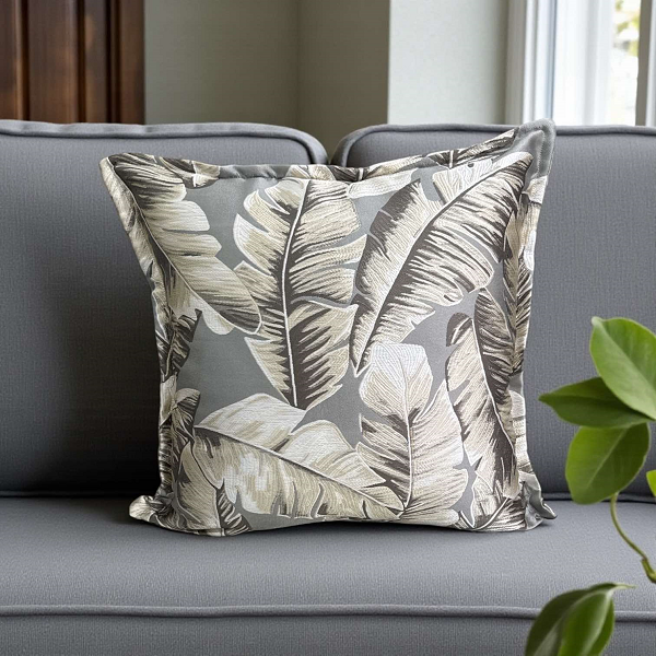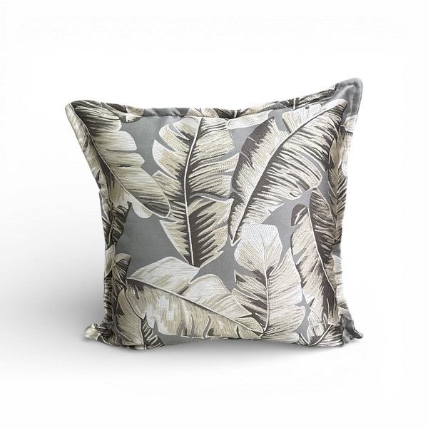 Διακοσμητικό μαξιλάρι με γέμισμα και πλακέ ραφή, σε σατέν ύφασμα χρώματος ελεφαντί με σχέδιο φύλλα.