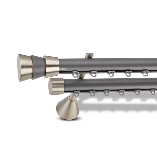 Κονταροσιδηρόδρομος Enis Σαντορίνη μονής ή διπλής βέργας, με ματ νίκελ στηρίγματα και ματ νίκελ λεπτομέρειες στο άκρο, με διάμετρο κονταριού Ø25mm.