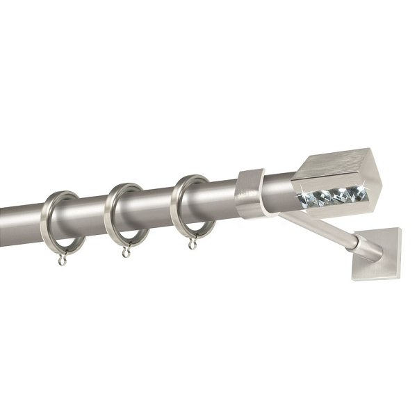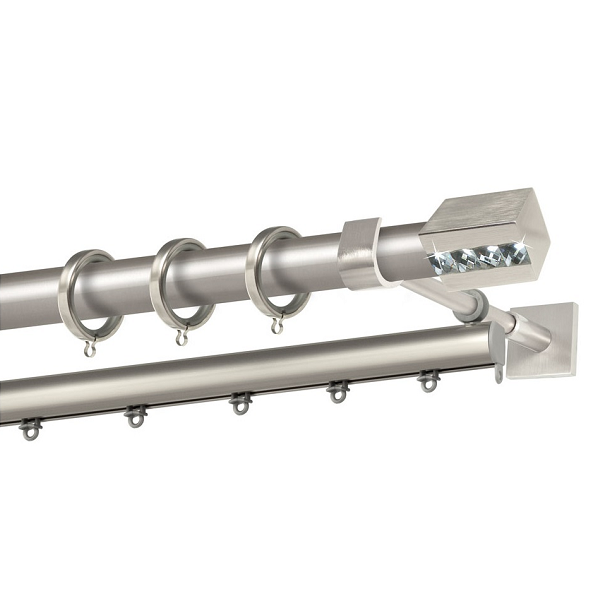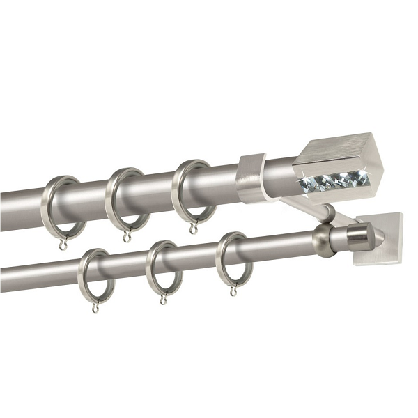 Μεταλλική κουρτινόβεργα Αγαθονήσι Strass της εταιρείας Perfect, σε πολλά χρώματα και πατίνες, σε μονή βέργα, διπλή βέργα ή διπλή με σιδηρόδρομο σε διάφορες διαστάσεις. Η διάμετρος της βέργας είναι Ø25mm και περιλαμβάνει έως 3 στηρίγματα ανάλογα με την διάσταση.