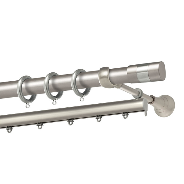 Μεταλλική κουρτινόβεργα Αλόννησος της εταιρείας Perfect, χρώματος Ματ Νίκελ/Χρώμιο, σε μονή βέργα, διπλή βέργα ή διπλή με σιδηρόδρομο σε διάφορες διαστάσεις. Η διάμετρος της βέργας είναι Ø25mm και περιλαμβάνει έως 3 στηρίγματα ανάλογα με την διάσταση.