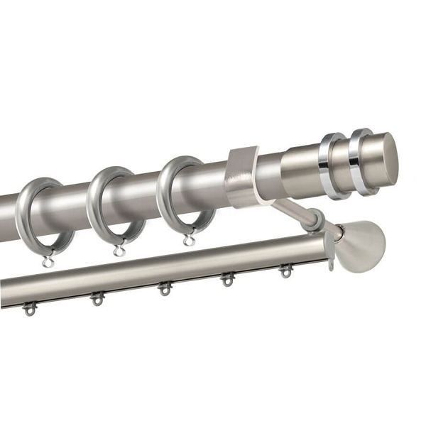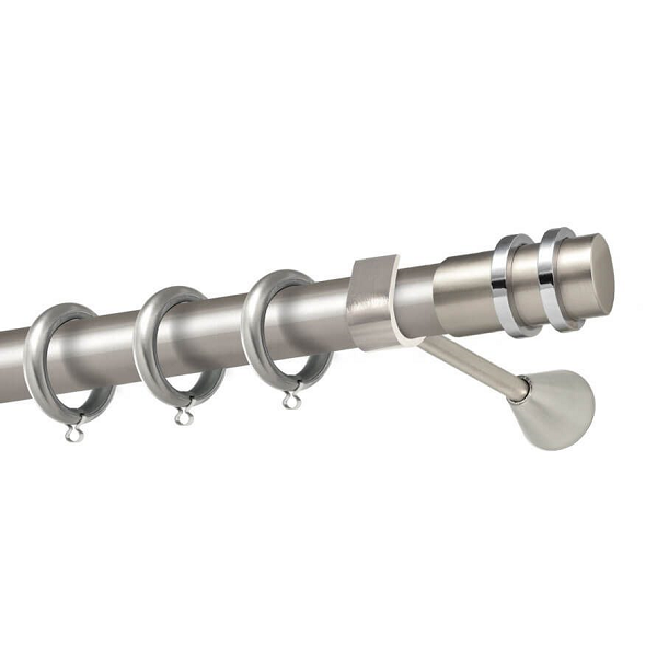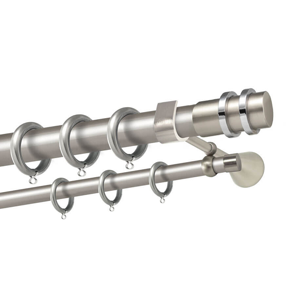 Μεταλλική κουρτινόβεργα Άνδρος της εταιρείας Perfect, χρώματος Ματ Νίκελ/Χρώμιο, σε μονή βέργα, διπλή βέργα ή διπλή με σιδηρόδρομο σε διάφορες διαστάσεις. Η διάμετρος της βέργας είναι Ø35mm και περιλαμβάνει έως 3 στηρίγματα ανάλογα με την διάσταση.