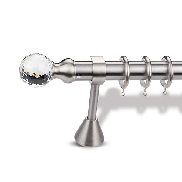 Μεταλλική ανοξείδωτη κουρτινόβεργα Enis Κρύσταλλο Ø60 σε μονή βέργα διαφόρων διαστάσεων. Η διάμετρος της βέργας είναι Ø35mm και περιλαμβάνει έως 3 στηρίγματα ανάλογα με την διάσταση.