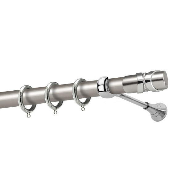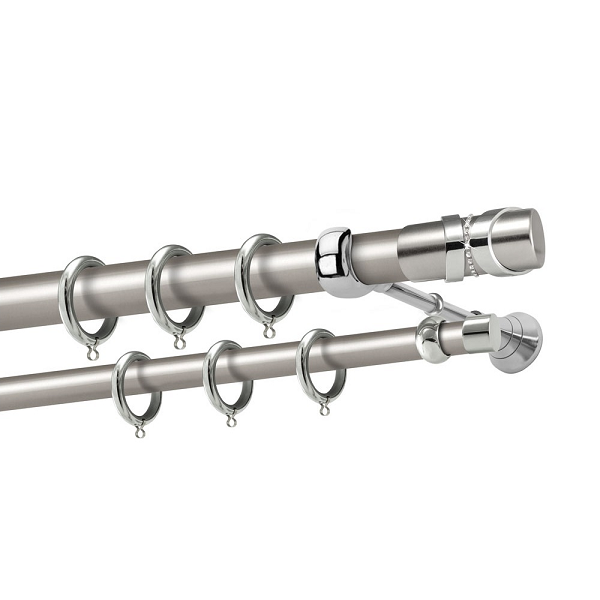 Μεταλλική κουρτινόβεργα Κάλυμνος Strass της εταιρείας Perfect, χρώματος Ματ Νίκελ/Χρώμιο, σε μονή βέργα, διπλή βέργα ή διπλή με σιδηρόδρομο σε διάφορες διαστάσεις. Η διάμετρος της βέργας είναι Ø25mm και περιλαμβάνει έως 3 στηρίγματα ανάλογα με την διάσταση.