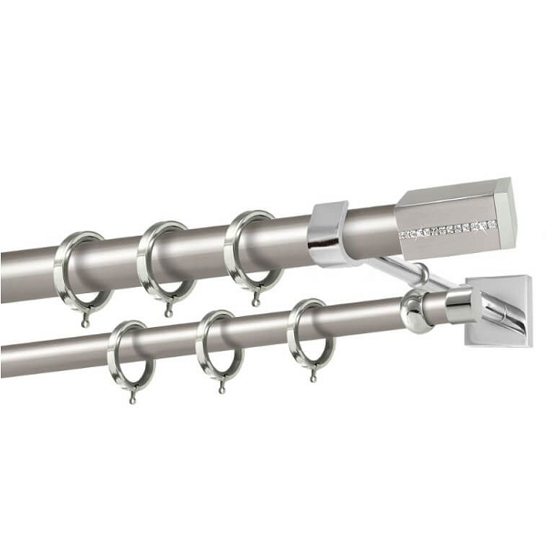 Μεταλλική κουρτινόβεργα Κέρκυρα Strass της εταιρείας Perfect, χρώματος Ματ Νίκελ, σε μονή βέργα, διπλή βέργα ή διπλή με σιδηρόδρομο σε διάφορες διαστάσεις. Η διάμετρος της βέργας είναι Ø25mm και περιλαμβάνει έως 3 στηρίγματα ανάλογα με την διάσταση.
