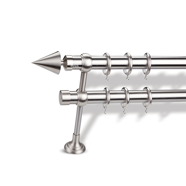 Μεταλλική κουρτινόβεργα Enis Κώνος σε διπλή βέργα διαφόρων διαστάσεων. Η διάμετρος της βέργας είναι Ø35mm και περιλαμβάνει έως 3 στηρίγματα ανάλογα με την διάσταση.