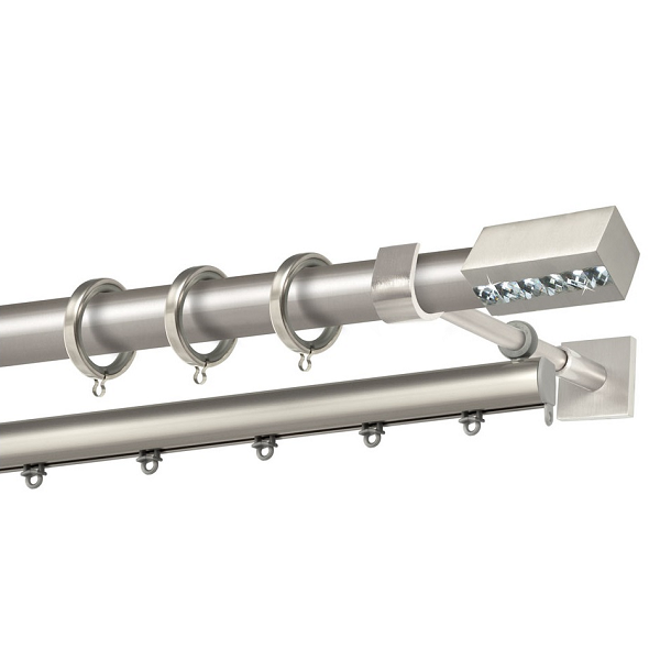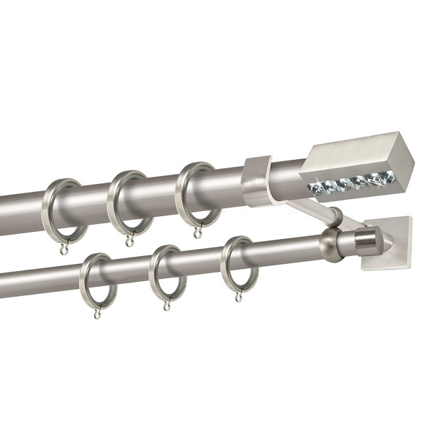 Μεταλλική κουρτινόβεργα Κως Strass της εταιρείας Perfect, χρώματος Ματ Νίκελ, σε μονή βέργα, διπλή βέργα ή διπλή με σιδηρόδρομο σε διάφορες διαστάσεις. Η διάμετρος της βέργας είναι Ø25mm και περιλαμβάνει έως 3 στηρίγματα ανάλογα με την διάσταση.