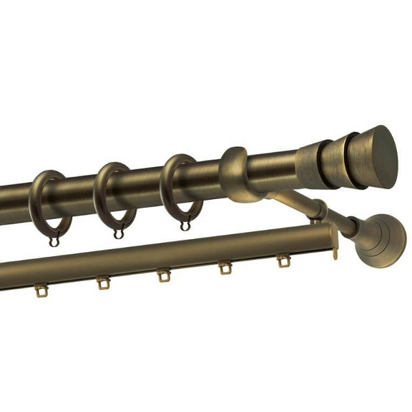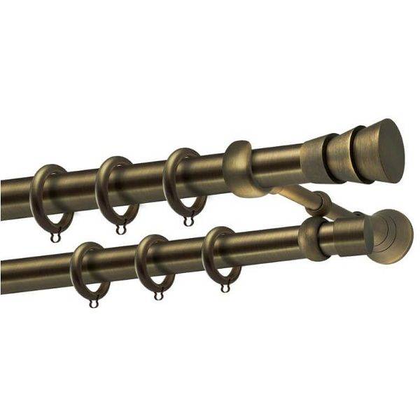 Μεταλλική κουρτινόβεργα Λευκάδα της εταιρείας Perfect, χρώματος Μπρονζέ, σε μονή βέργα, διπλή βέργα ή διπλή με σιδηρόδρομο σε διάφορες διαστάσεις. Η διάμετρος της βέργας είναι Ø25mm και περιλαμβάνει έως 3 στηρίγματα ανάλογα με την διάσταση.
