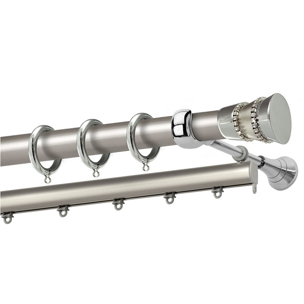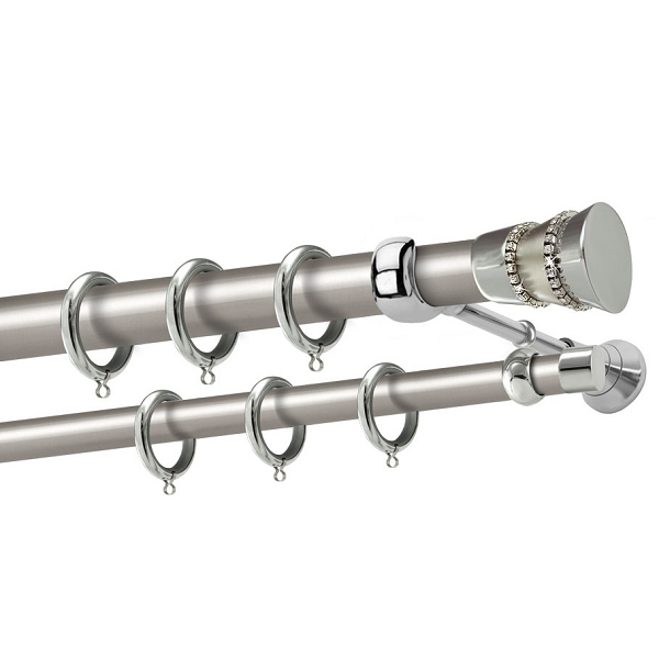 Μεταλλική κουρτινόβεργα Λευκάδα Strass της εταιρείας Perfect, χρώματος Ματ Νίκελ/Χρώμιο, σε μονή βέργα, διπλή βέργα ή διπλή με σιδηρόδρομο σε διάφορες διαστάσεις. Η διάμετρος της βέργας είναι Ø25mm και περιλαμβάνει έως 3 στηρίγματα ανάλογα με την διάσταση.