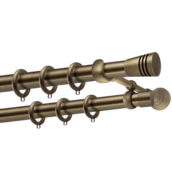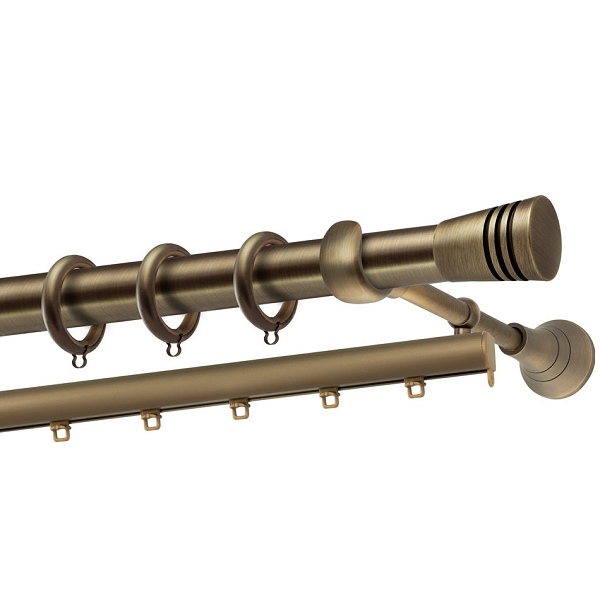 Μεταλλική κουρτινόβεργα Αμοργός της εταιρείας Perfect, χρώματος Μπρονζέ, σε μονή βέργα, διπλή βέργα ή διπλή με σιδηρόδρομο σε διάφορες διαστάσεις. Η διάμετρος της βέργας είναι Ø25mm και περιλαμβάνει έως 3 στηρίγματα ανάλογα με την διάσταση.