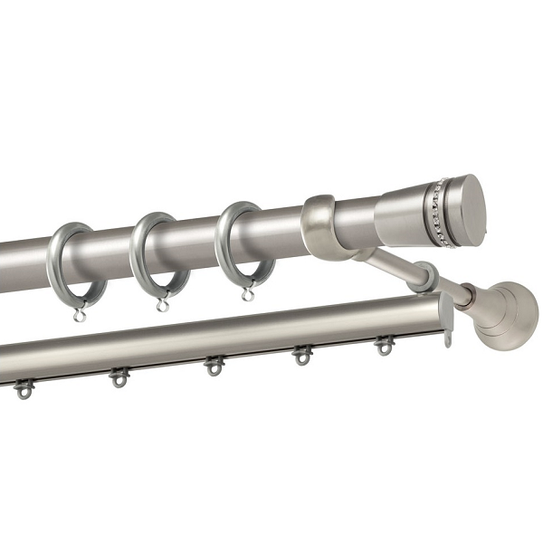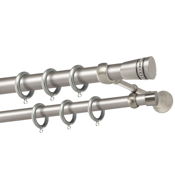 Μεταλλική κουρτινόβεργα Αμοργός Strass της εταιρείας Perfect, χρώματος Ματ Νίκελ, σε μονή βέργα, διπλή βέργα ή διπλή με σιδηρόδρομο σε διάφορες διαστάσεις. Η διάμετρος της βέργας είναι Ø25mm και περιλαμβάνει έως 3 στηρίγματα ανάλογα με την διάσταση.