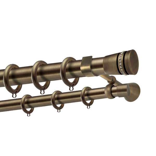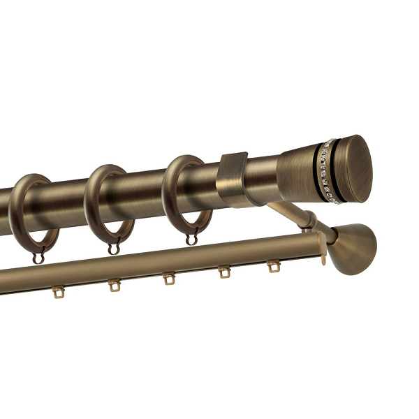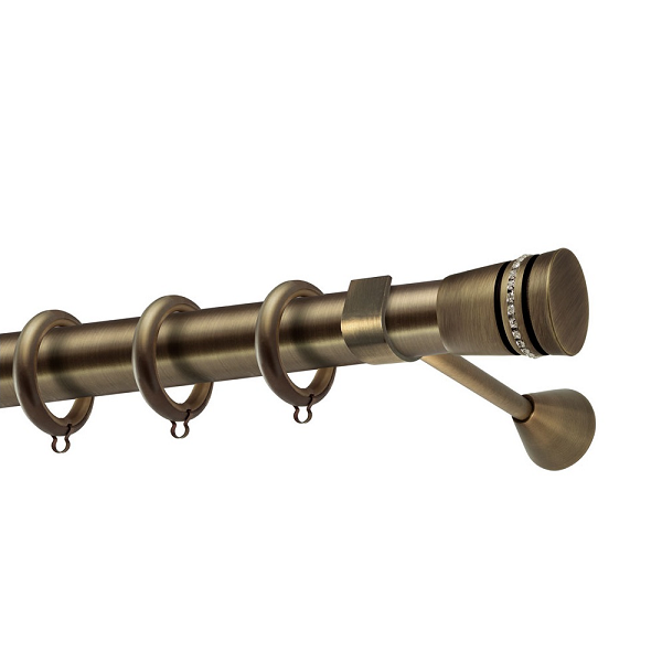 Μεταλλική κουρτινόβεργα Λέρος Strass της εταιρείας Perfect, χρώματος Μπρονζέ, σε μονή βέργα, διπλή βέργα ή διπλή με σιδηρόδρομο σε διάφορες διαστάσεις. Η διάμετρος της βέργας είναι Ø35mm και περιλαμβάνει έως 3 στηρίγματα ανάλογα με την διάσταση.