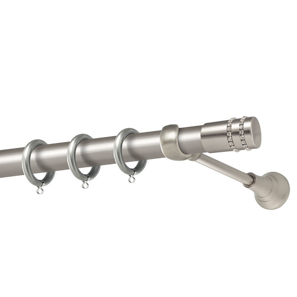 Μεταλλική κουρτινόβεργα Λέσβος Strass της εταιρείας Perfect, χρώματος Ματ Νίκελ, σε μονή βέργα, διπλή βέργα ή διπλή με σιδηρόδρομο σε διάφορες διαστάσεις. Η διάμετρος της βέργας είναι Ø25mm και περιλαμβάνει έως 3 στηρίγματα ανάλογα με την διάσταση.