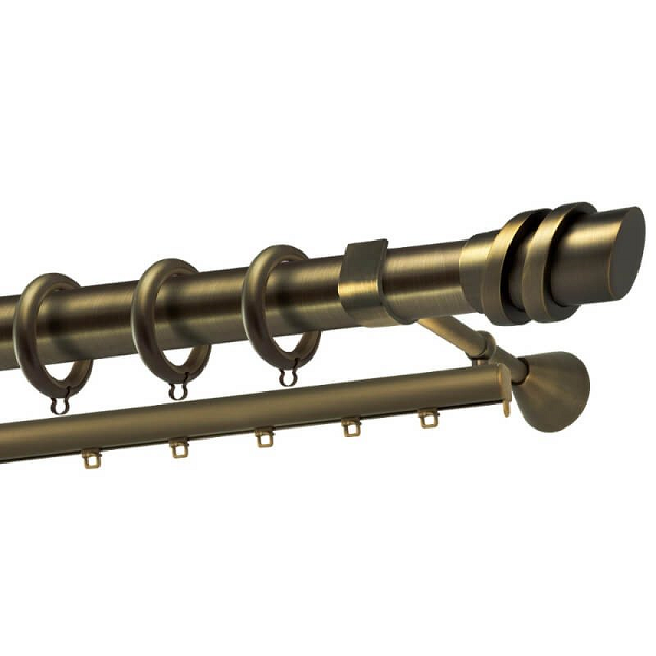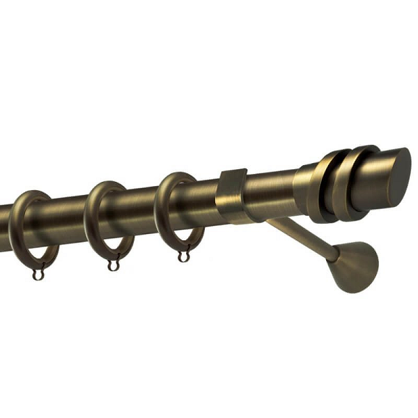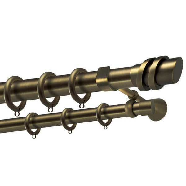 Μεταλλική κουρτινόβεργα Πάρος της εταιρείας Perfect, χρώματος Μπρονζέ, σε μονή βέργα, διπλή βέργα ή διπλή με σιδηρόδρομο σε διάφορες διαστάσεις. Η διάμετρος της βέργας είναι Ø35mm και περιλαμβάνει έως 3 στηρίγματα ανάλογα με την διάσταση.