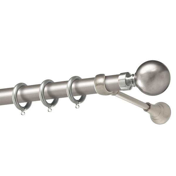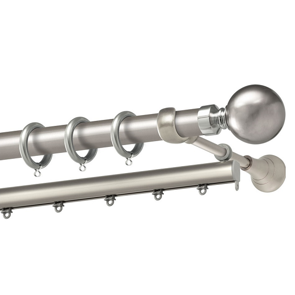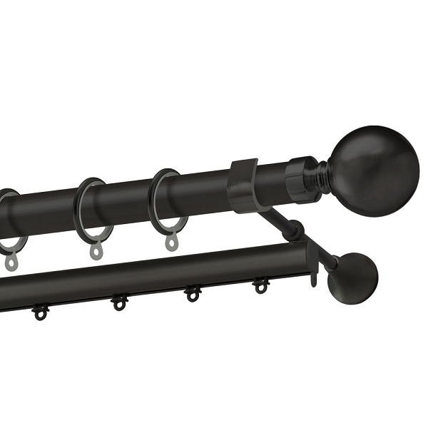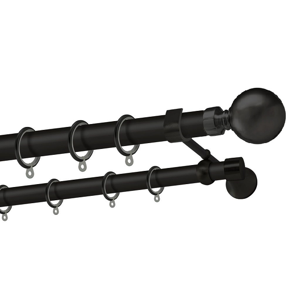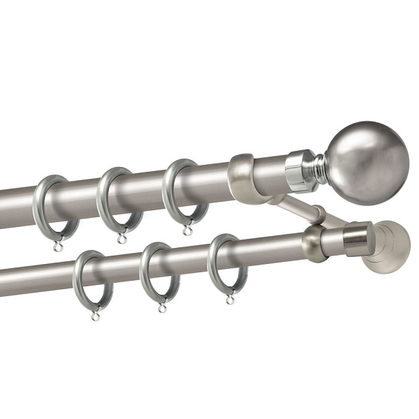 Μεταλλική κουρτινόβεργα Ρόδος της εταιρείας Perfect, χρώματος Ματ Νίκελ, Ματ Μαύρο ή πατίνα, σε μονή βέργα, διπλή βέργα ή διπλή με σιδηρόδρομο σε διάφορες διαστάσεις. Η διάμετρος της βέργας είναι Ø25mm και περιλαμβάνει έως 3 στηρίγματα ανάλογα με την διάσταση.