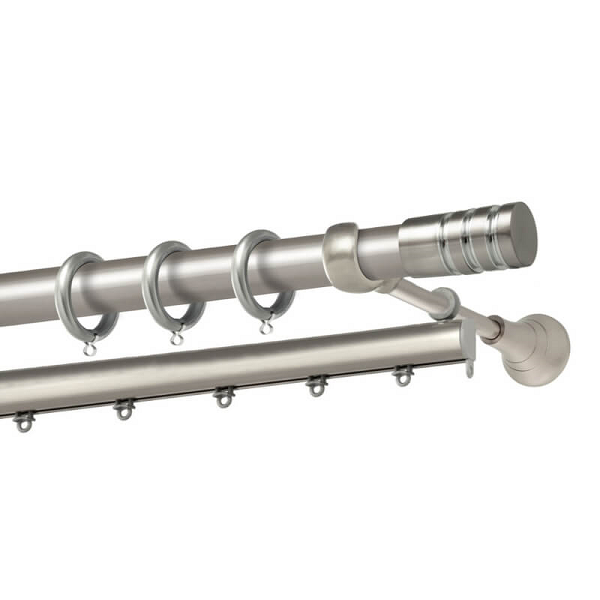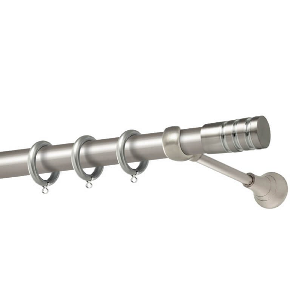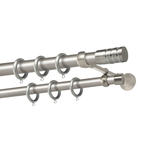 Μεταλλική κουρτινόβεργα Σαντορίνη της εταιρείας Perfect, χρώματος Ματ Νίκελ, σε μονή βέργα, διπλή βέργα ή διπλή με σιδηρόδρομο σε διάφορες διαστάσεις. Η διάμετρος της βέργας είναι Ø25mm και περιλαμβάνει έως 3 στηρίγματα ανάλογα με την διάσταση.
