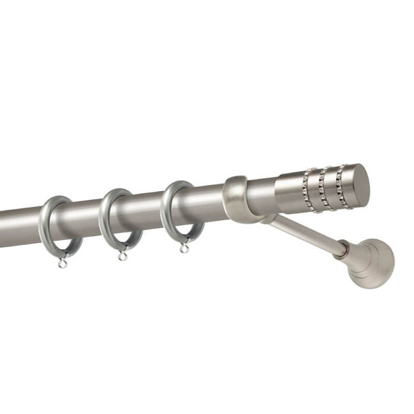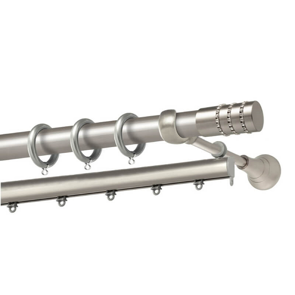 Μεταλλική κουρτινόβεργα Σαντορίνη Strass της εταιρείας Perfect, χρώματος Ματ Νίκελ, σε μονή βέργα, διπλή βέργα ή διπλή με σιδηρόδρομο σε διάφορες διαστάσεις. Η διάμετρος της βέργας είναι Ø25mm και περιλαμβάνει έως 3 στηρίγματα ανάλογα με την διάσταση.