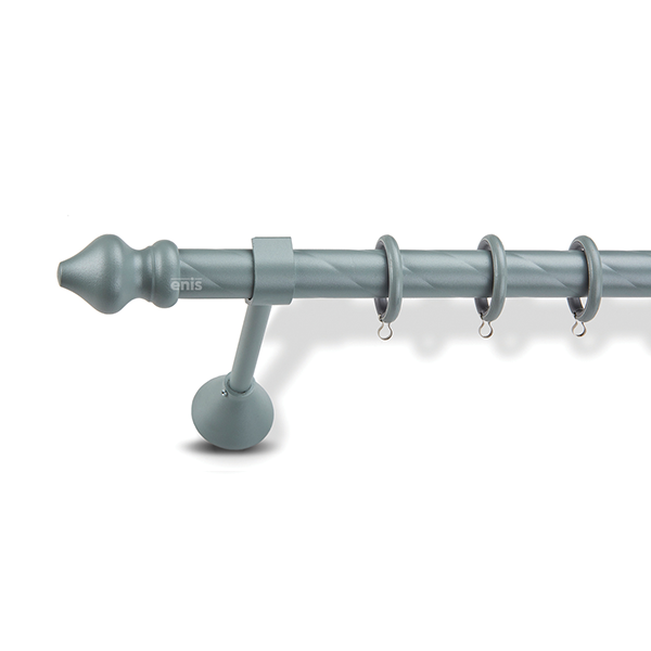 Μεταλλική κουρτινόβεργα στριφτή Enis Μπαρόκο σε μονή βέργα, διπλή βέργα ή διπλή με σιδηρόδρομο σε διάφορες διαστάσεις. Η διάμετρος της βέργας είναι Ø25mm και περιλαμβάνει έως 3 στηρίγματα ανάλογα με την διάσταση.
