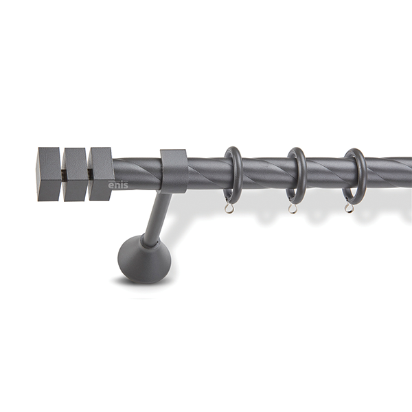 Μεταλλική κουρτινόβεργα στριφτή Enis Κλεοπάτρα σε μονή βέργα, διπλή βέργα ή διπλή με σιδηρόδρομο σε διάφορες διαστάσεις. Η διάμετρος της βέργας είναι Ø25mm και περιλαμβάνει έως 3 στηρίγματα ανάλογα με την διάσταση.
