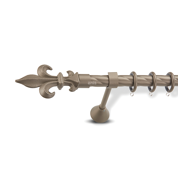 Μεταλλική κουρτινόβεργα στριφτή Enis Λόγχη Ιπποτών σε μονή βέργα, διπλή βέργα ή διπλή με σιδηρόδρομο σε διάφορες διαστάσεις. Η διάμετρος της βέργας είναι Ø25mm και περιλαμβάνει έως 3 στηρίγματα ανάλογα με την διάσταση.