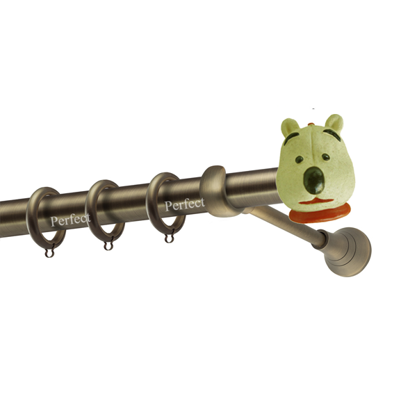 Μεταλλική κουρτινόβεργα Γουίνι της εταιρείας Perfect, χρώματος Μπρονζέ, σε μονή βέργα, διπλή βέργα ή διπλή με σιδηρόδρομο σε διάφορες διαστάσεις. Η διάμετρος της βέργας είναι Ø25mm και περιλαμβάνει έως 3 στηρίγματα ανάλογα με την διάσταση.