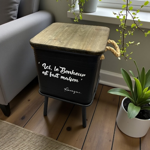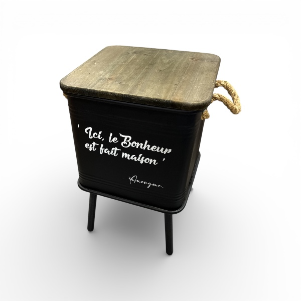 Μεταλλικό βοηθητικό τραπεζάκι σε μαύρο χρώμα, με λαβές από σχοινί και αφαιρούμενο ξύλινο καπάκι για αποθηκευτικό χώρο.