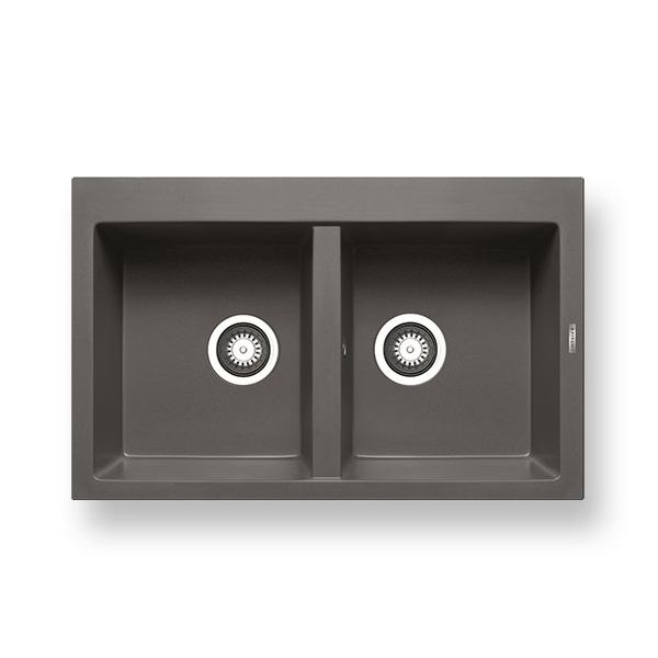 Νεροχύτης Pyramis Pyragranite Alazia, διαστάσεων 79x50cm σε χρώμα iron grey, κατασκευασμένος από υψηλής απόδοσης φυσικό χαλαζία, με δύο γούρνες και ένθετη εγκατάσταση.