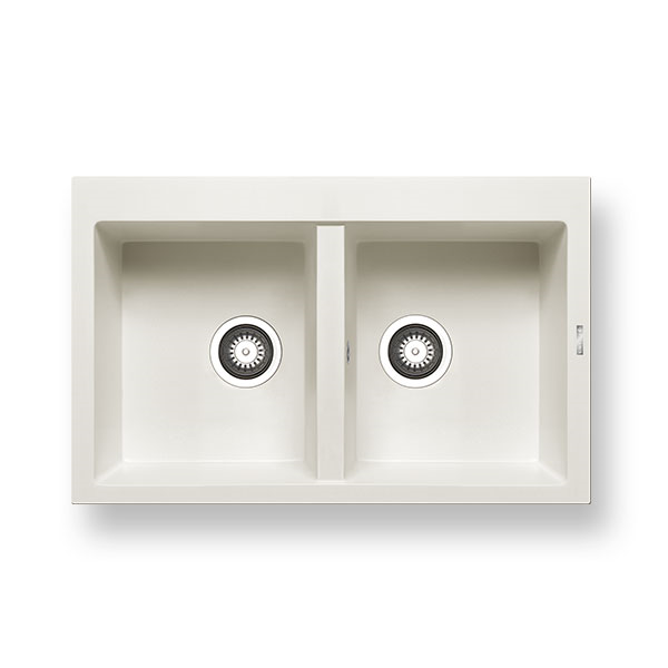 Νεροχύτης Pyramis Pyragranite Alazia, διαστάσεων 79x50cm σε χρώμα snow, κατασκευασμένος από υψηλής απόδοσης φυσικό χαλαζία, με δύο γούρνες και ένθετη εγκατάσταση.