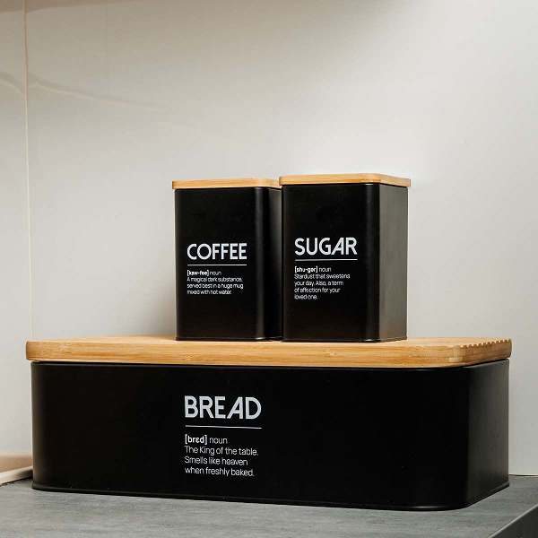 Ψωμιέρα Bamboo Essentials μεταλλική σε μαύρο χρώμα με καπάκι από bamboo, κατάλληλο και για επιφάνεια κοπής.